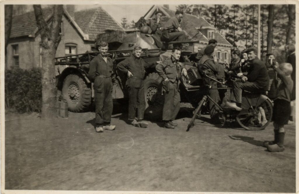 Bewoners rond een Canadese pantserwagen tegenover de woning Oosteinde 10 tijdens de bevrijding van Nieuwleusen. Op de achtergrond links de woning van Jans Willems en rechts groenteboer Wildvank. Vlnr: Arend van Spijker (1919-1956), Jan Willems, soldaten en met de fiets Jan Brouwer. Het militaire voertuig is een Staghound pantserwagen van de (Canadese) XII Manitoba Dragoons, om precies te zijn de zgn. “Sergeants Car” van 3rd Troop A-squadron.